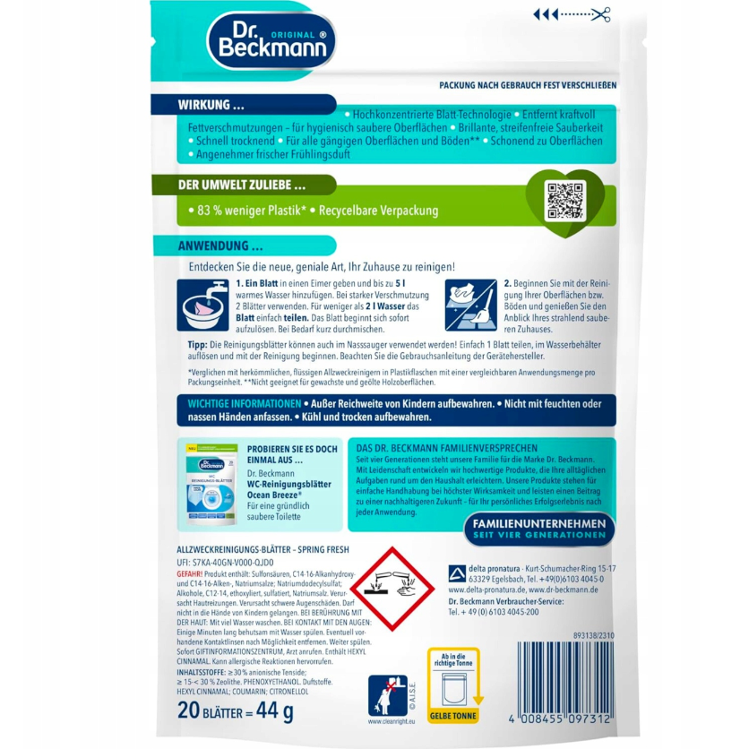 Dr Beckmann to marka z wieloletnią tradycją, która od lat dostarcza innowacyjne rozwiązania do czyszczenia domów. Uniwersalne Listki Czyszczące do Podłogi to gwarancja czystości i świeżości bez zbędnego wysiłku.